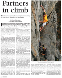 An Associated Press article describing the book project ran in many newspapers across New York State, including Sunday's New York Times, Sports section (section 8), page 5. The article describes the emphasis we're placing on the rock climbing history and gives several examples. The Times article ran with two photos, the top photo is the route Kingdom Come (5.12a A0), and the bottom photo is Creation of the World (5.11c).